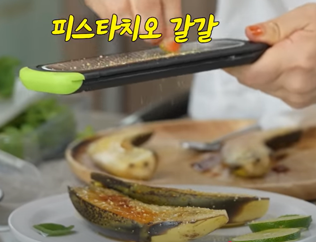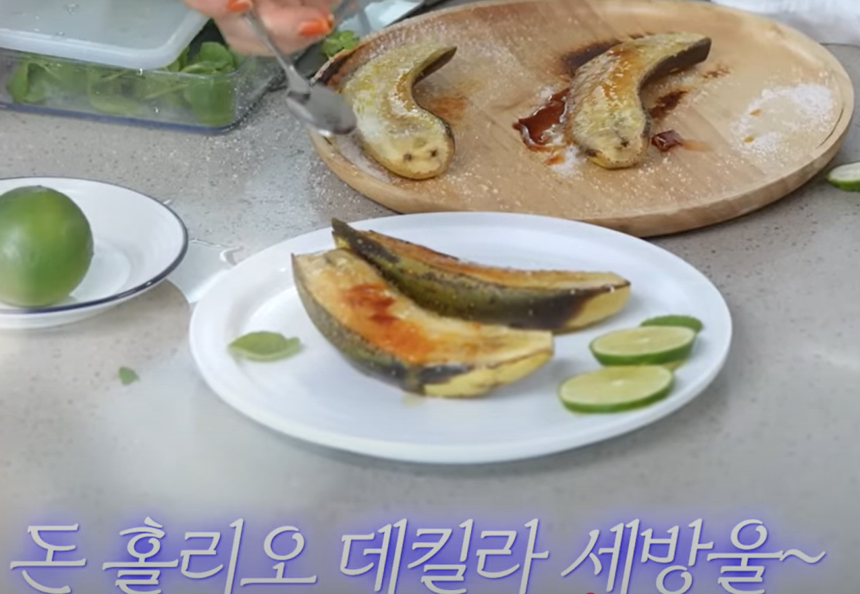 재료: 잘 익은 바나나 1개, 설탕 1~2큰술, 데킬라 조금, 라임 한 개, 말돈 소금 약간, 피스타치오 약간, 토치